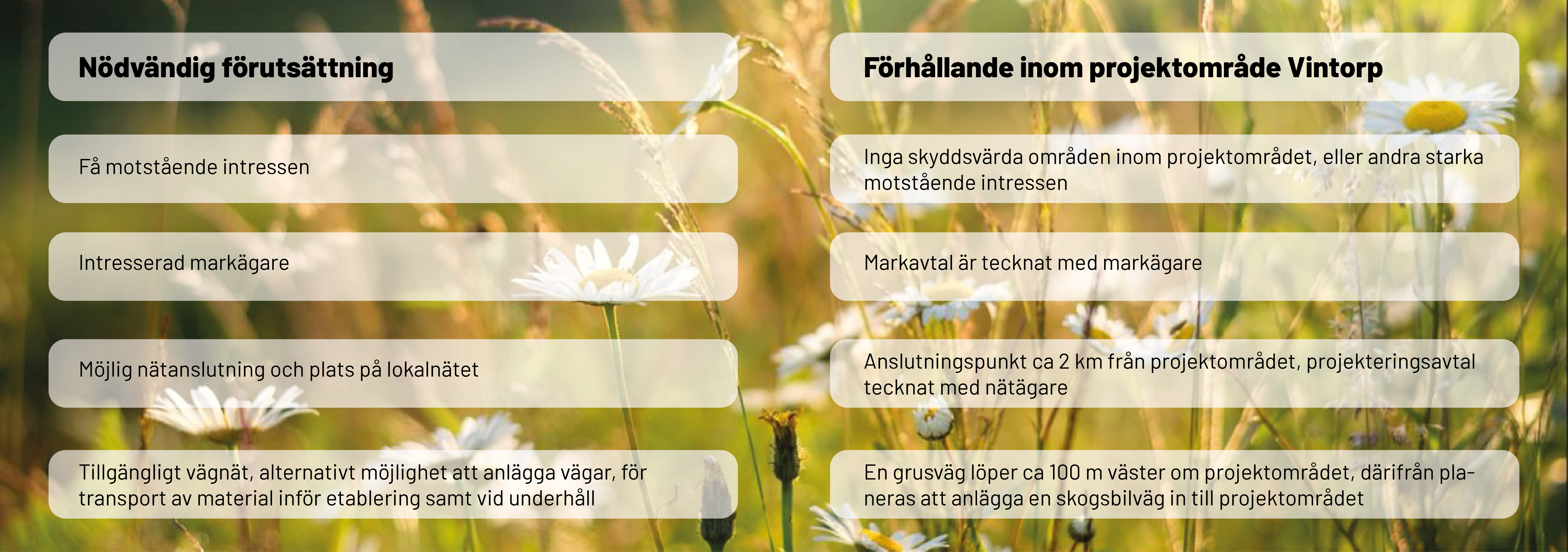 Det finns flera olika förutsättningar som krävs för att det ska vara meningsfullt att utreda möjligheten att etablera en solcellspark. I tabellen nedan redogörs översiktligt för nödvändiga förutsättningar, samt de förhållanden som råder inom det planerade projektområdet Vintorp.