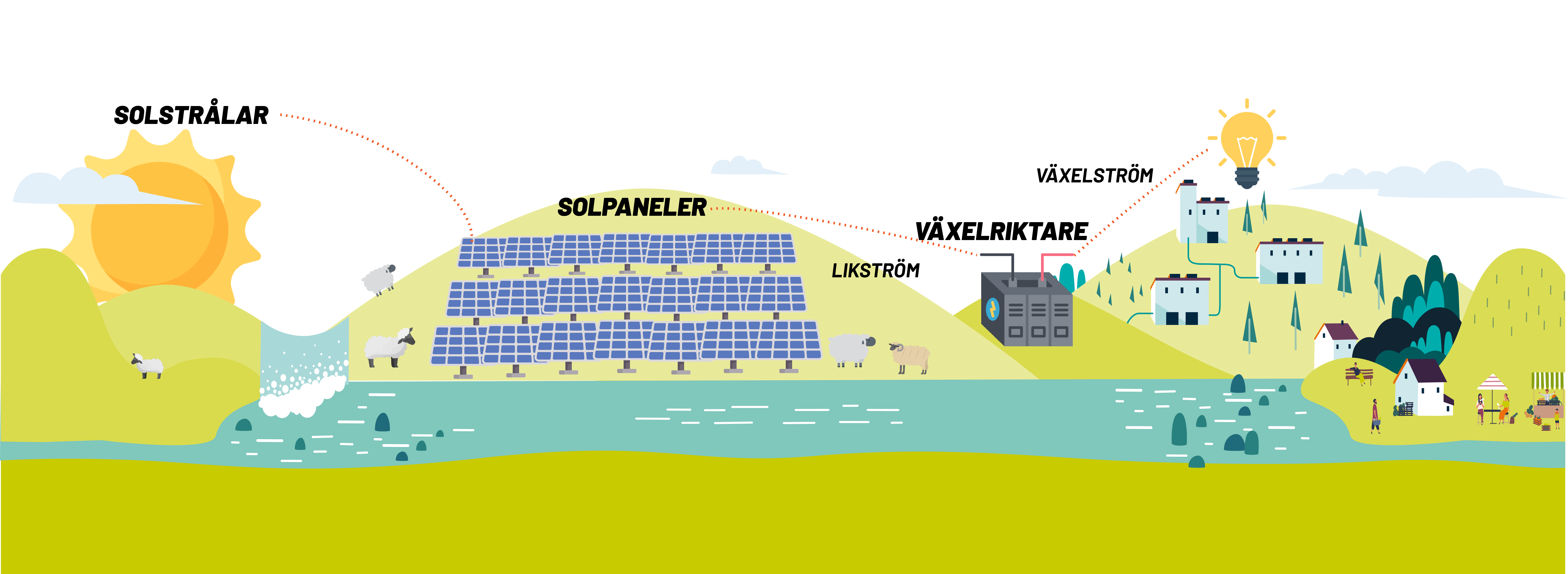 Naturskyddsföreningen beskriver processen för solenergi såhär på sin hemsida:Solceller kan generera el direkt från solljuset utan någon generator eller något som snurrar. Solceller består av ett tunt halvledarmaterial, oftast kisel, som gör att de kan fånga solens energi och omvandla den till el. När solen lyser på solcellen uppstår en elektrisk spänning mellan dess fram- och baksida. Om fram- och baksidan kopplas samman med en elkabel börjar elektroner röra sig från den ena sidan till den andra. En elektrisk ström har skapats! Om flera solceller seriekopplas ökar spänningen, medan strömstyrkan ökar om de istället parallellkopplas.